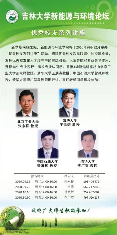 新学期来临之际,巨乳自拍 将于2020年9月—12月举办“优秀校友系列讲座”活动。搭建优秀校友和学院师生的交流桥梁,发挥优秀校友在人才培养中的思想引领、人生导航和专业导学作用,开拓学生专业视野,激发专业认同感。首批4场特邀讲座将由北京工业大学张永祥教授、清华大学王洪涛教授、中国石油大学曾溅辉教授、清华大学李广贺教授领衔开讲。欢迎老师同学积极参加!