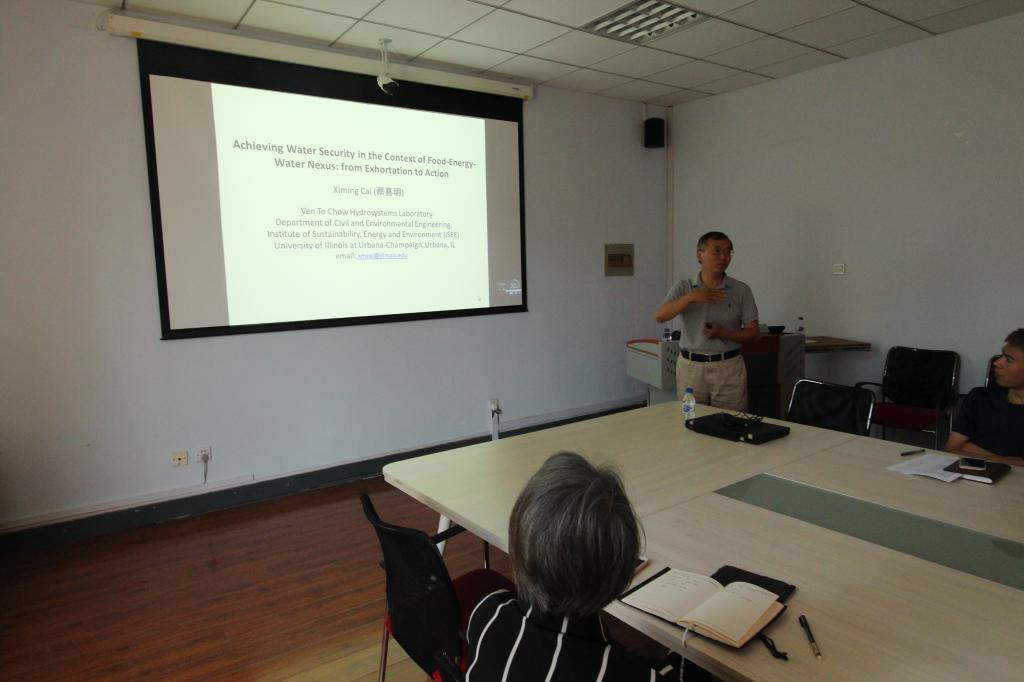 师生作题为 “Achieving Water Security in the Context of Food-Energy -Water Nexus : from Exhortation to Action” 学术报告。此学术报告由地下水科学与工程系李鸿雁教授主持,在报告会上,蔡喜明教授阐述了水环境安全管理的相关研究,以全新的食物-能源-水环境科研体系为新能源与环境的师生拓宽了科研思维。师生们对蔡喜明教授的研究课题表示很感兴趣,并与蔡教授就水环境安全问题进行了深入探讨,收获颇丰。