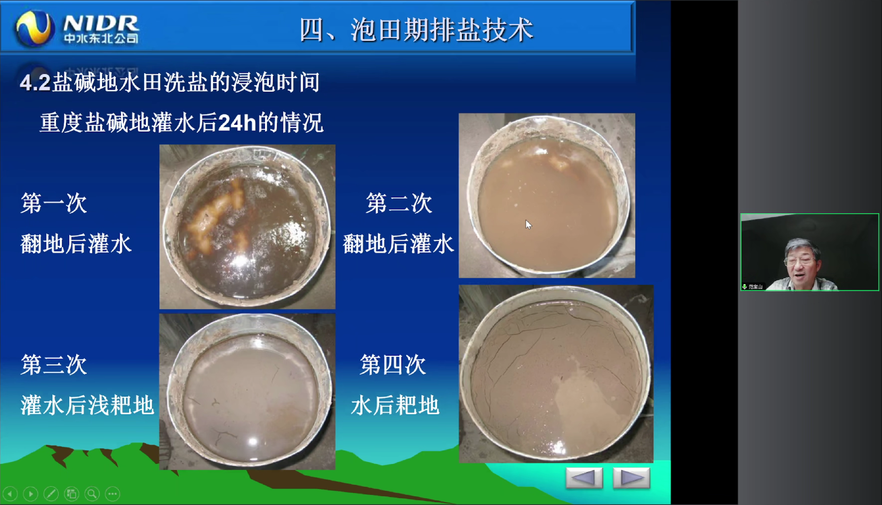 范宝山总工还介绍了轻、中、重度盐碱地水田实验研究情况,讲述了在泡田期和本田期采用的灌溉制度,并强调了控制土壤中盐碱垂向运动的重要性。通过分享实践经验向听众传授了盐碱地水田建设的关键技术和策略。