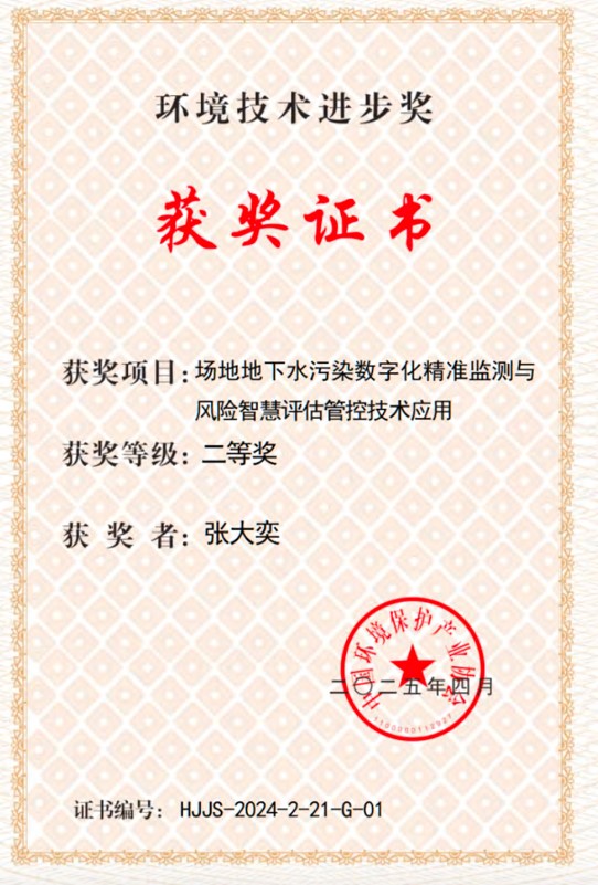 凭借“场地地下水污染数字化精准监测与风险智慧评估管控技术应用”项目(项目编号:HJJS-2024-2-21)从全国优秀技术成果中脱颖而出,获“2024年度环境技术进步二等奖”。该项目由巨乳自拍