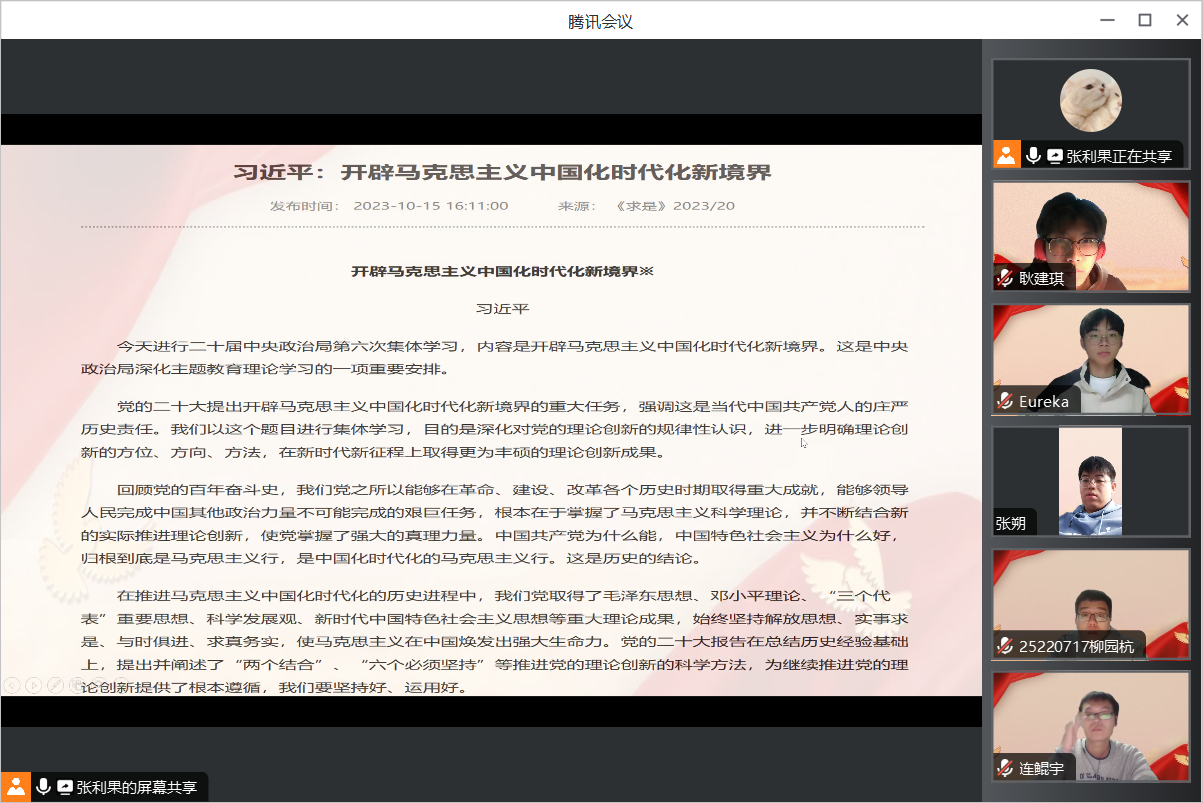 本次团日活动各团支部通过线上线下相结合的形式进行,各班团支书带领班级同学一同学习了“最新论述”中的文章。文章内容包罗万象,《习近平:开辟马克思主义中国化时代化新境界》《扎实推动教育强国建设》《在学习贯彻习近平新时代中国特色社会主义思想主题教育工作会议上的讲话》等。虽然主题与内容各有不同,但都蕴含着“习近平新时代中国特色社会主义思想”这一精神内核,同学们通过对文章的阅读,了解国家大事,学习先进思想,提升理论知识。