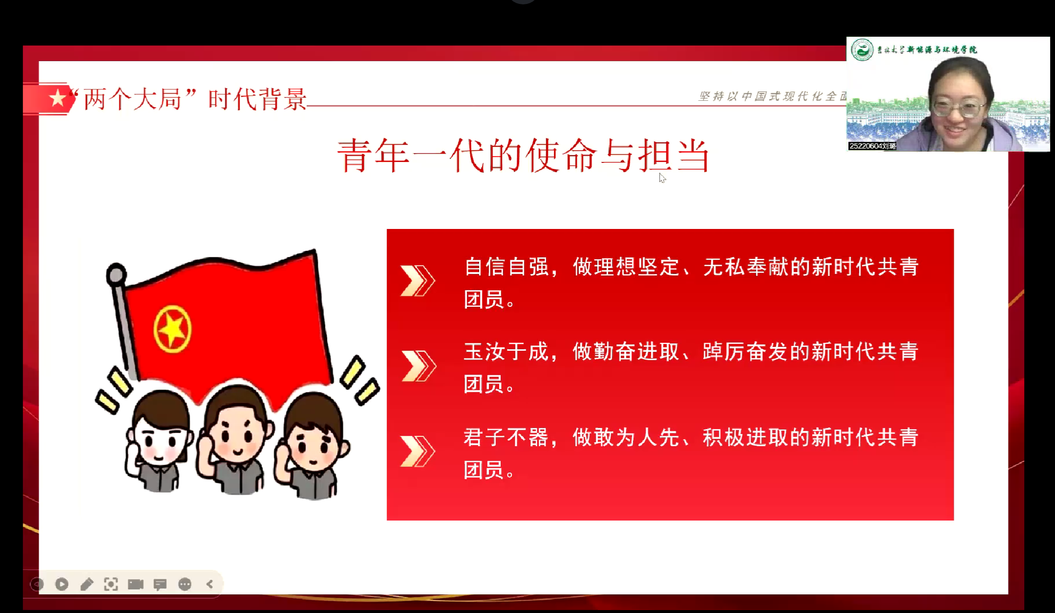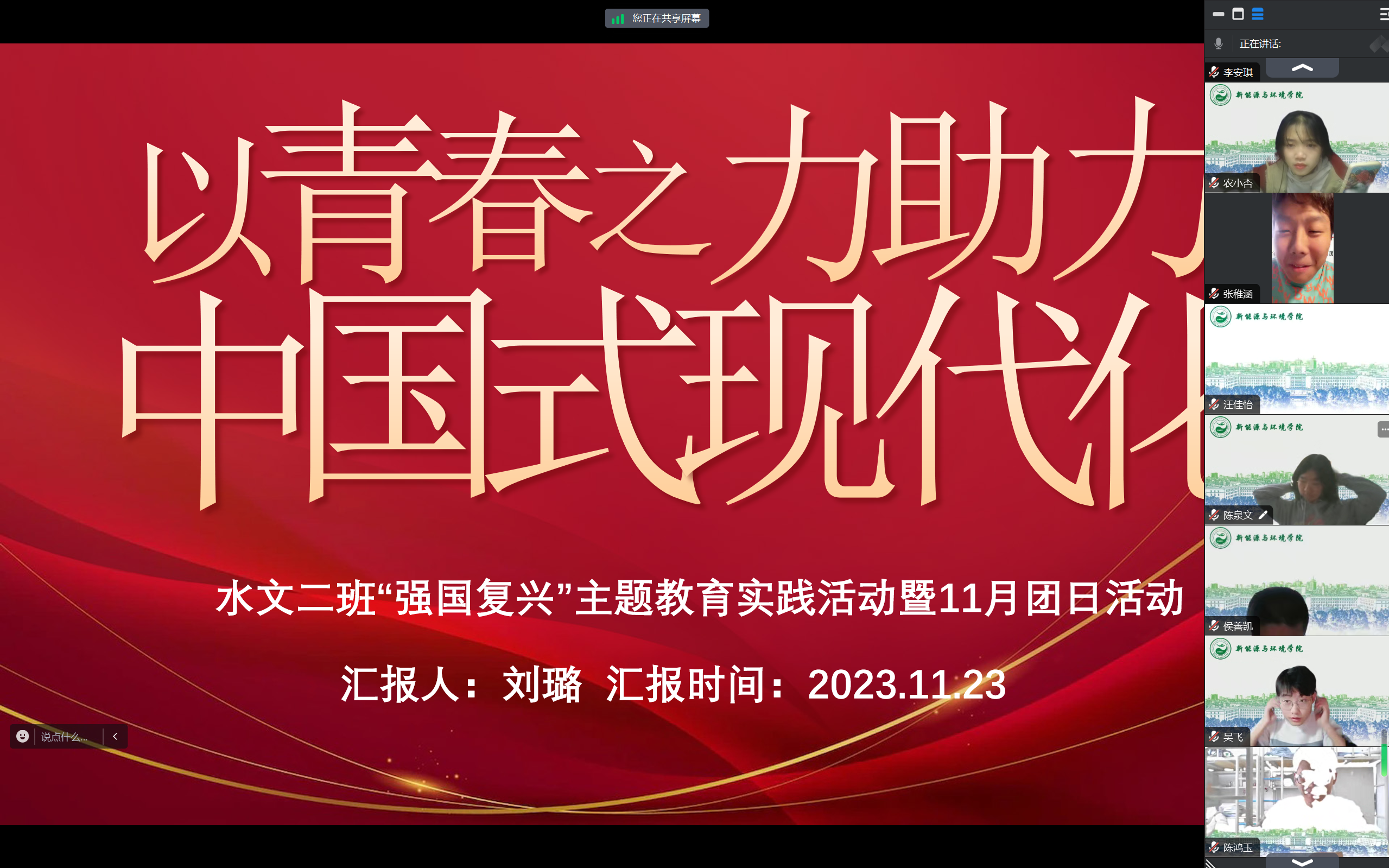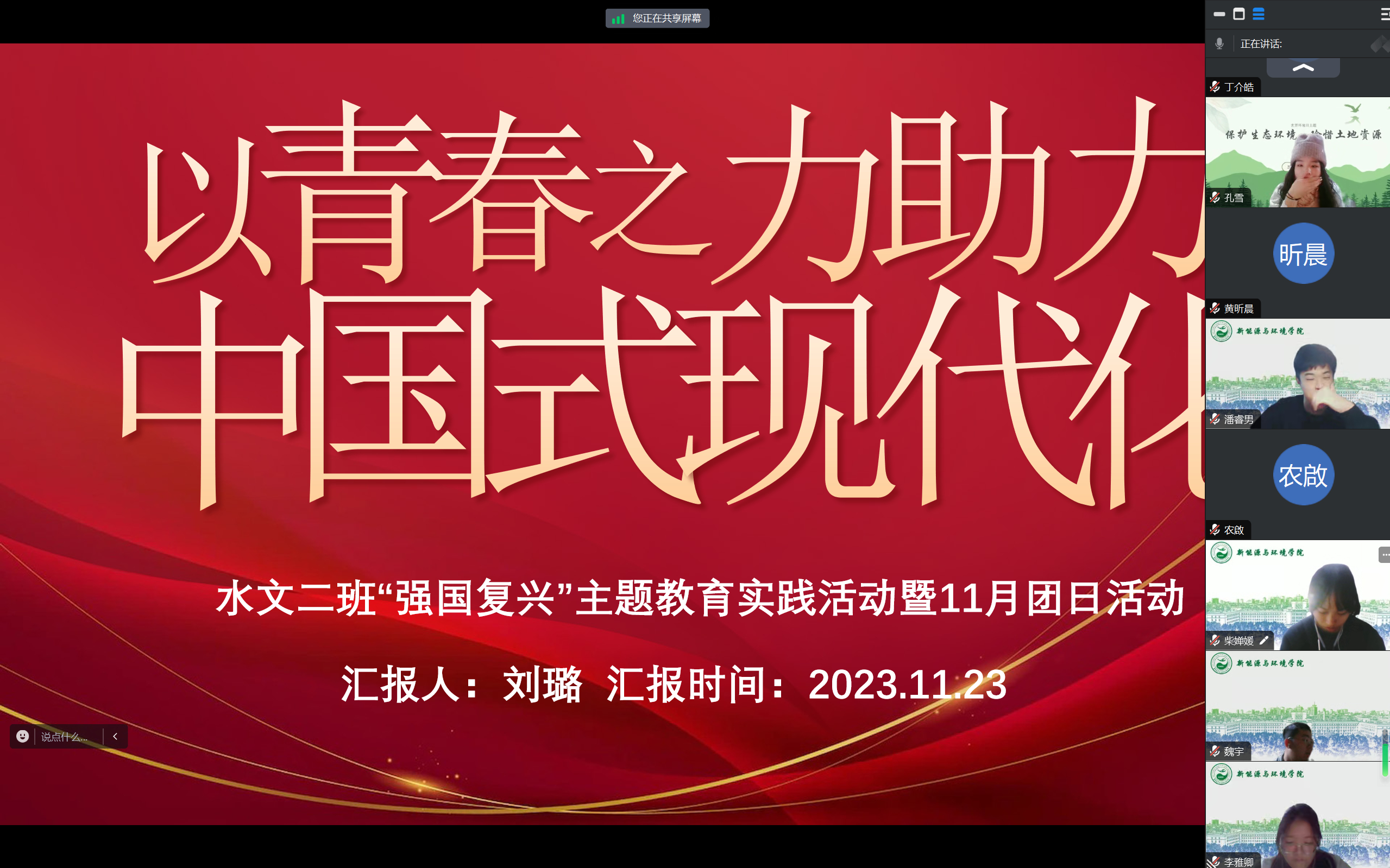 252226班的同学们在团支书刘璐的带领下,于腾讯会议线上召开了“强国复兴”主题教育实践活动暨11月团日活动,届时全体团员参会。本次团日活动的开展形式为集中学习讨论,采用“团员主讲,支书帮讲”的形式开展座谈会,提高同学们学习思考的积极性。