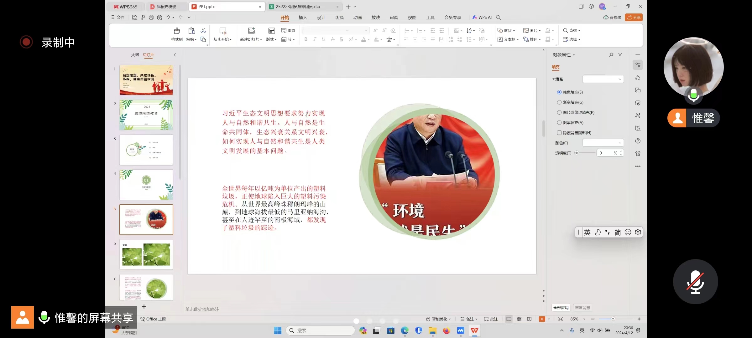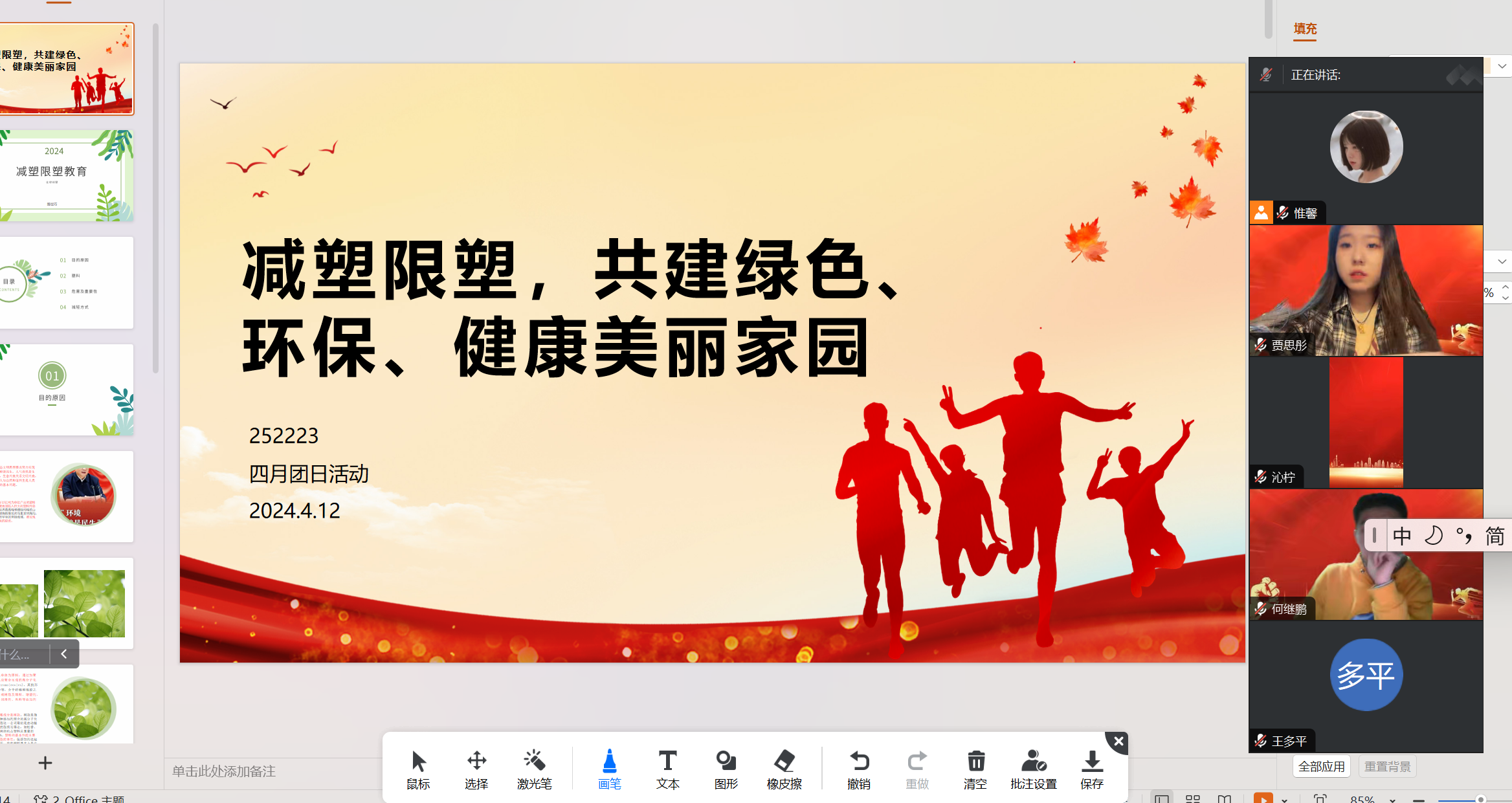 252223班团支部于4月12日晚八点在团支书路世巧的带领下,于线上开展学习《减塑限塑共建绿色、环保、健康美丽家园》暨4月团日活动。本次团日活动共有包括支部内25名共青团员在内的28位青年参加。