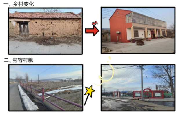 小队首先实地调查了乡村外貌的变化,实践队员在所调查乡村拍摄图片,其他队员将图片后期加工合成,发展前后的对比更加一目了然。为了优化村容,村里整修河坝,道路两旁用木箱种花,集中收集处理垃圾,修建文化走廊。除调查乡村外貌的变化,小队还调查了村民农田种植方面的变化,村里整修了沟渠,不再依靠传统的井水灌溉,而是从河流中引水,极大的便利了农民。农作物的种植管理过程大多依靠机器设备,机器播种、无人机喷洒农药、机器收割,不仅节约了人力和时间,也提供了一些工作岗位。