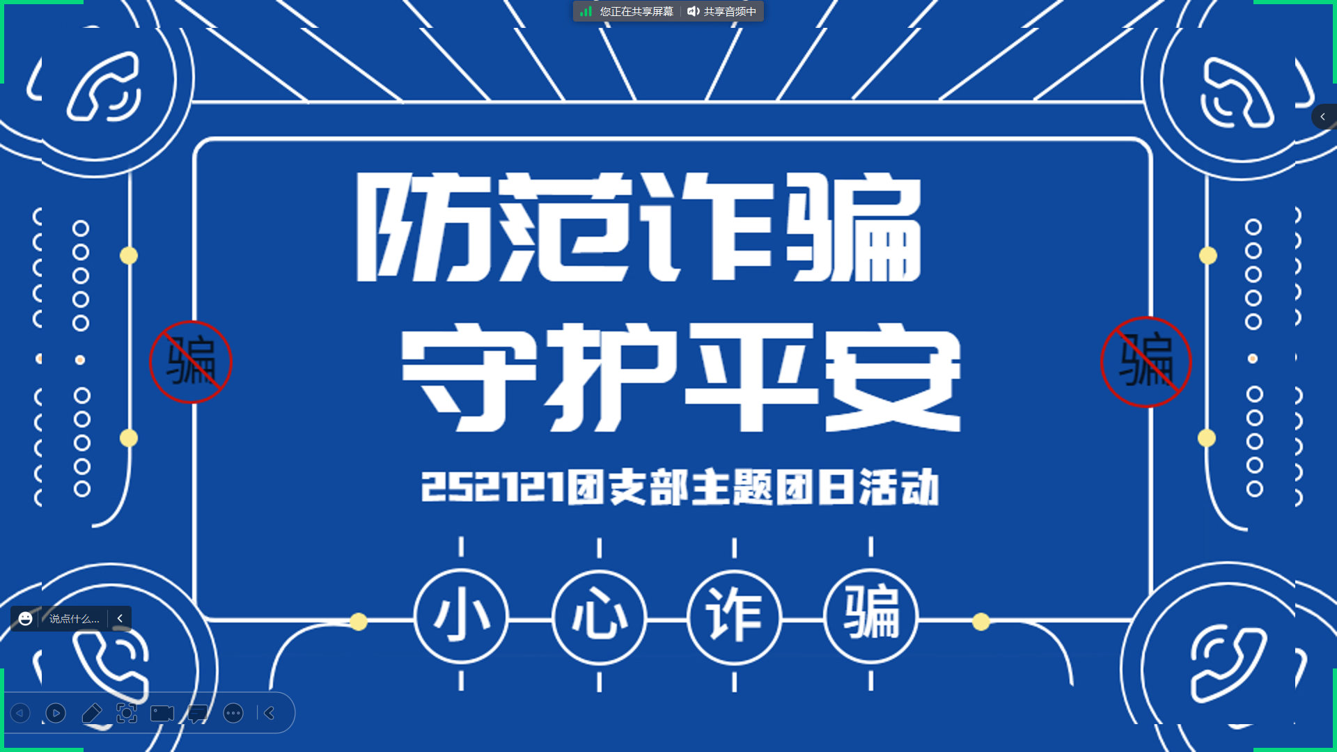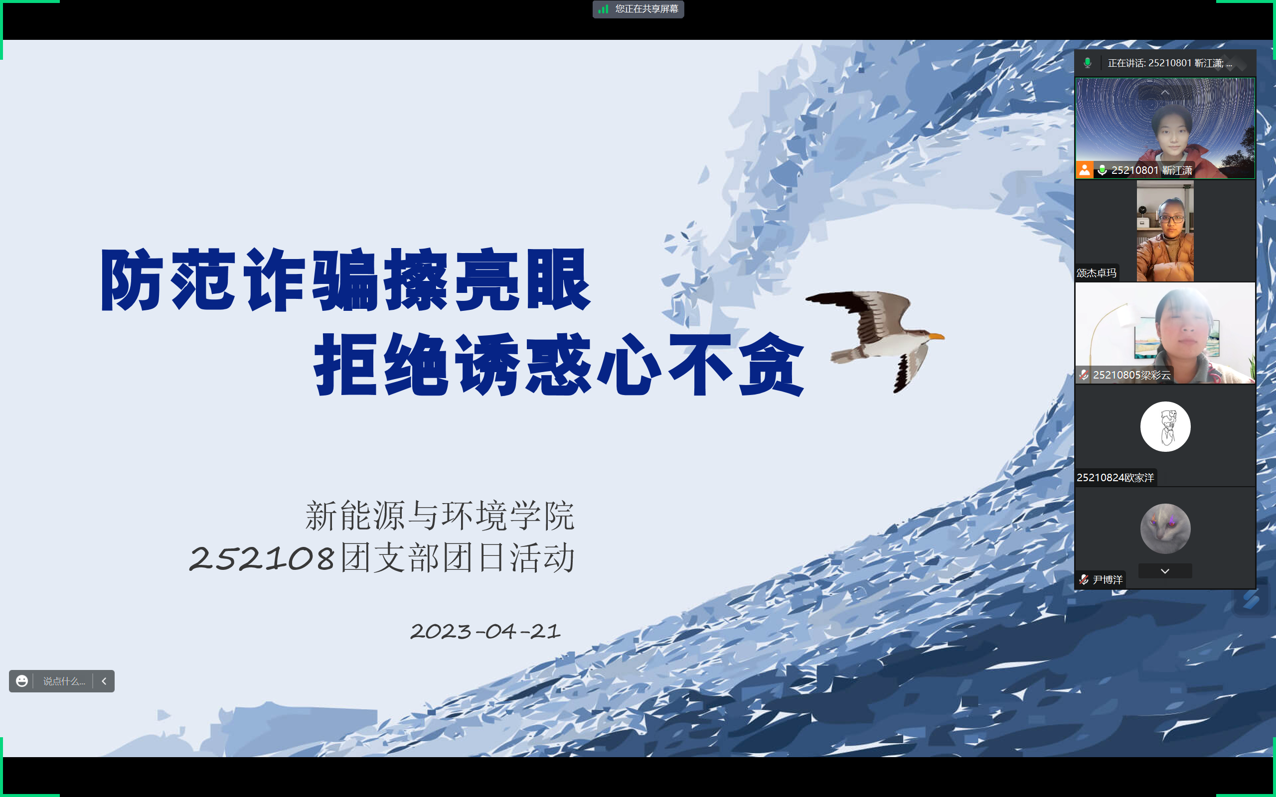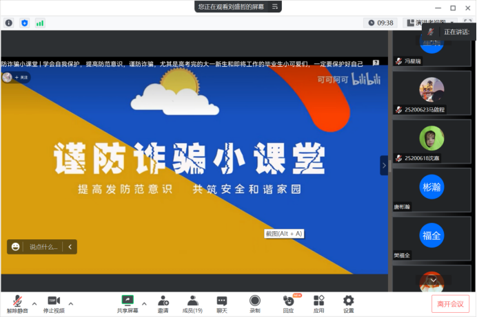 252026班团支书严新月同学引领大家了解了一些常见的诈骗手法和套路,比如假冒官方机构、冒充亲友、利用人们的好奇心和恐惧心理进行诈骗等等,呼吁大家保持警惕,提高防骗意识,远离这些陷阱。同时也分享了一些防范诈骗的经验和方法,如:不在公共网络环境下随意登录银行账号,不随意透露个人敏感信息,不相信绝对不可能的高额回报等等。只有大家积极行动、提高警惕,才能有效地减少网络犯罪和诈骗的风险,让生活更加安全和稳定。