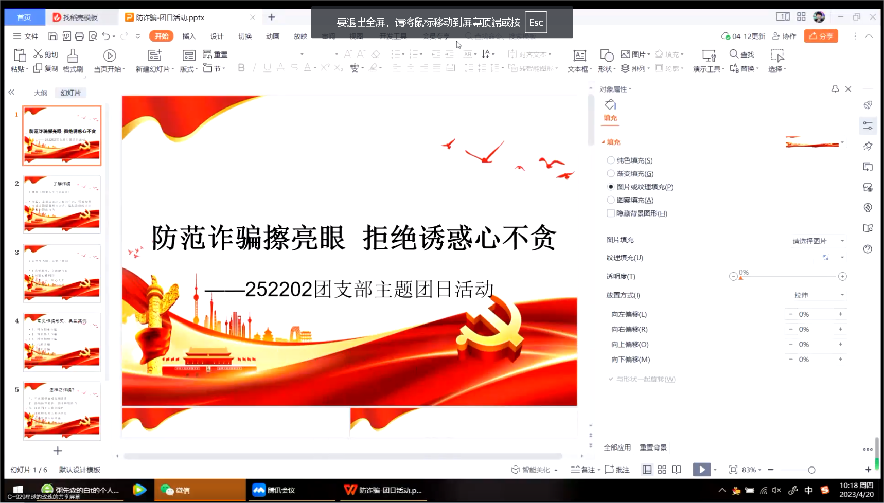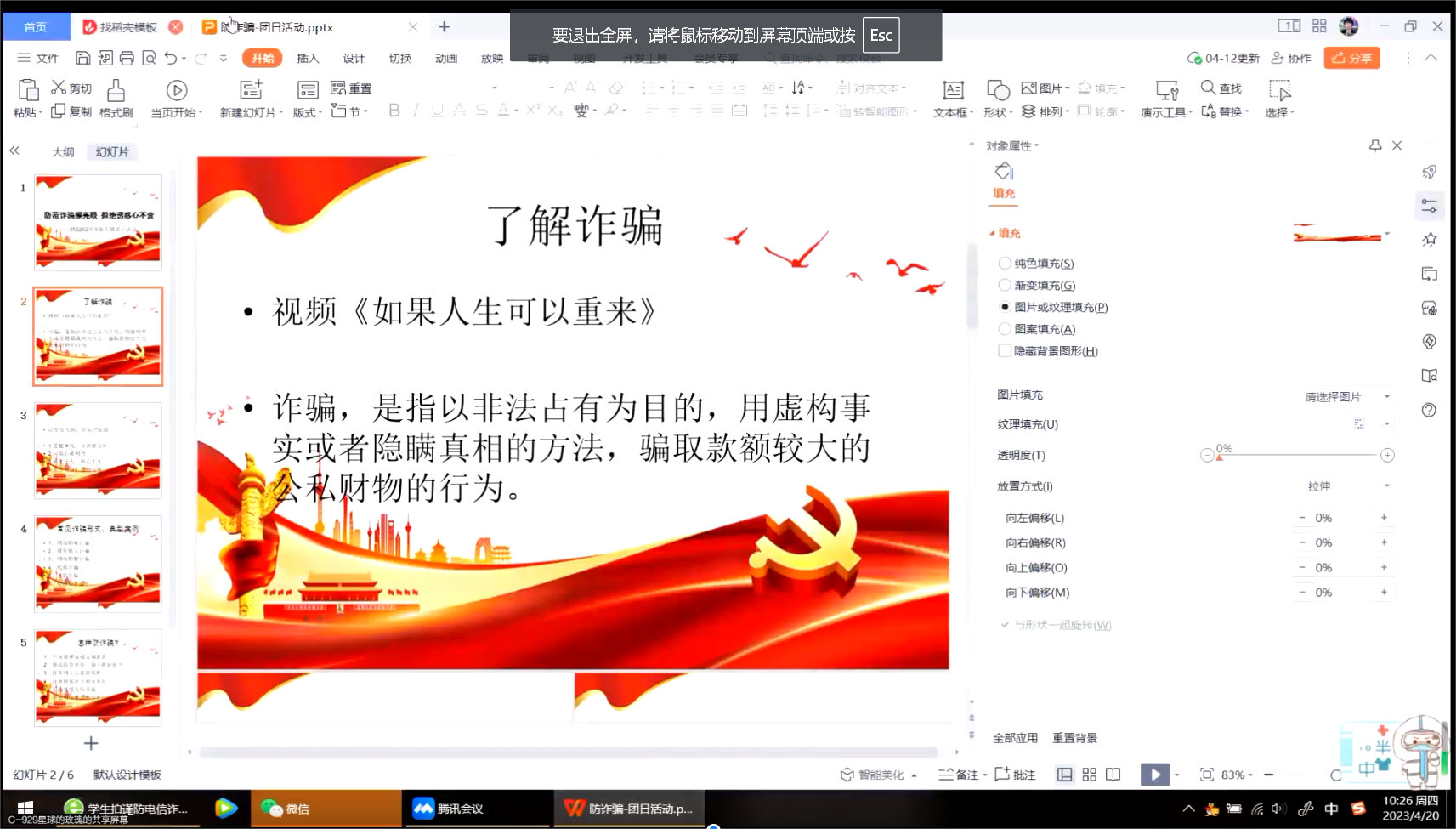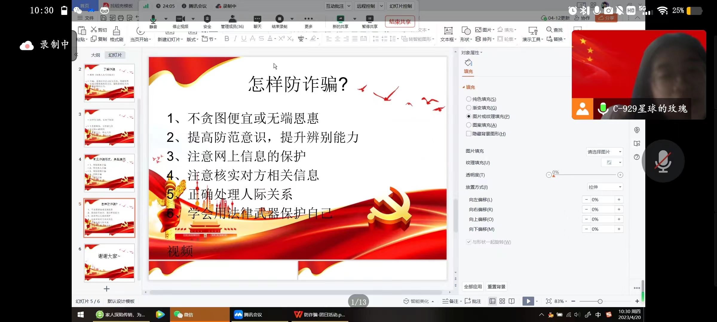 252202班团支部于4月20日上午十点在团支书郭诗语的带领下,于线上开展“防范诈骗擦亮眼 拒绝诱惑心不贪”反电信网络诈骗宣传教育主题团日活动。本次团日活动共有包括支部内29名共青团员在内的34位青年参加。