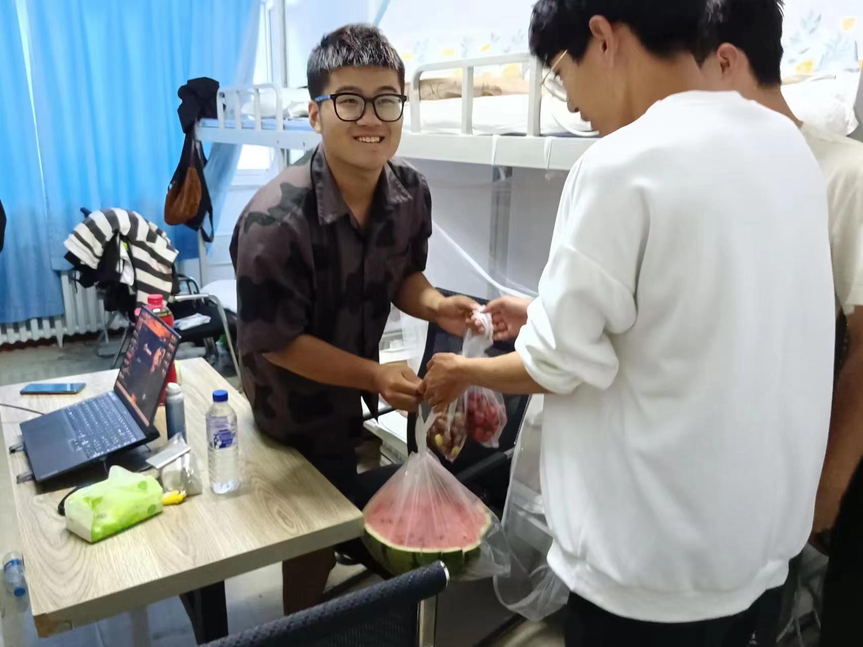 晚上,学院为师生们购买的西瓜、甜枣、小番茄等水果被送到教职工公寓和学生寝室,分发慰问品的过程中,欢声笑语响满走廊。学院的关心关爱,让大家更加珍惜本次实习机会,让在基地的师生们拉近距离感受到家的温暖。