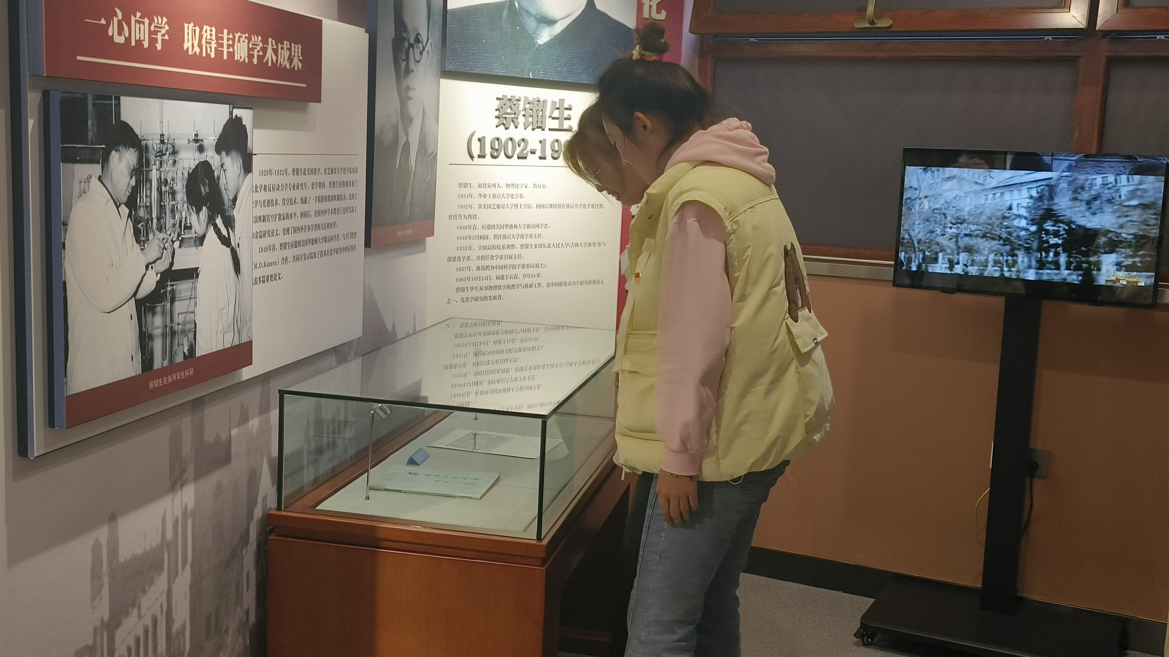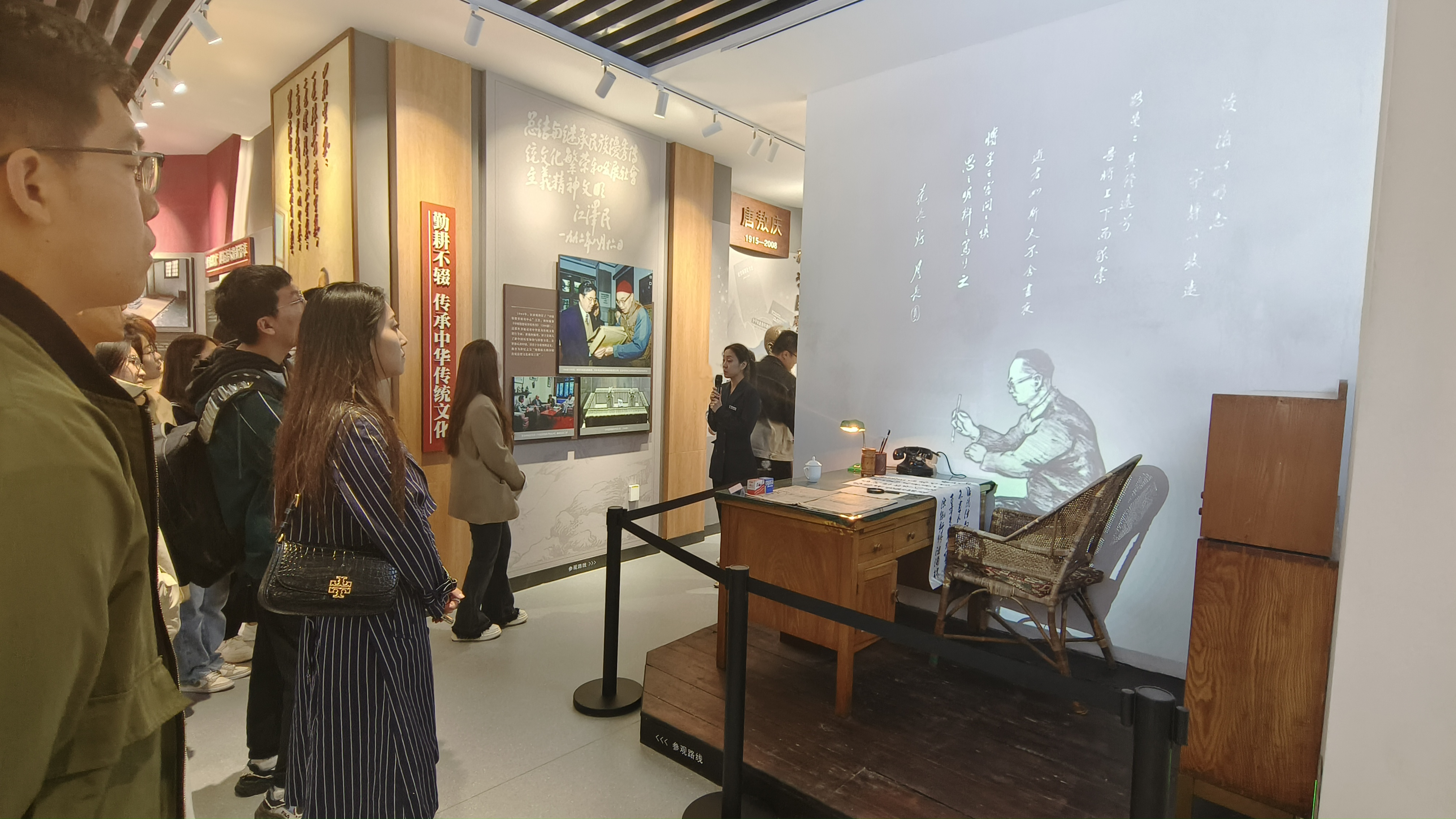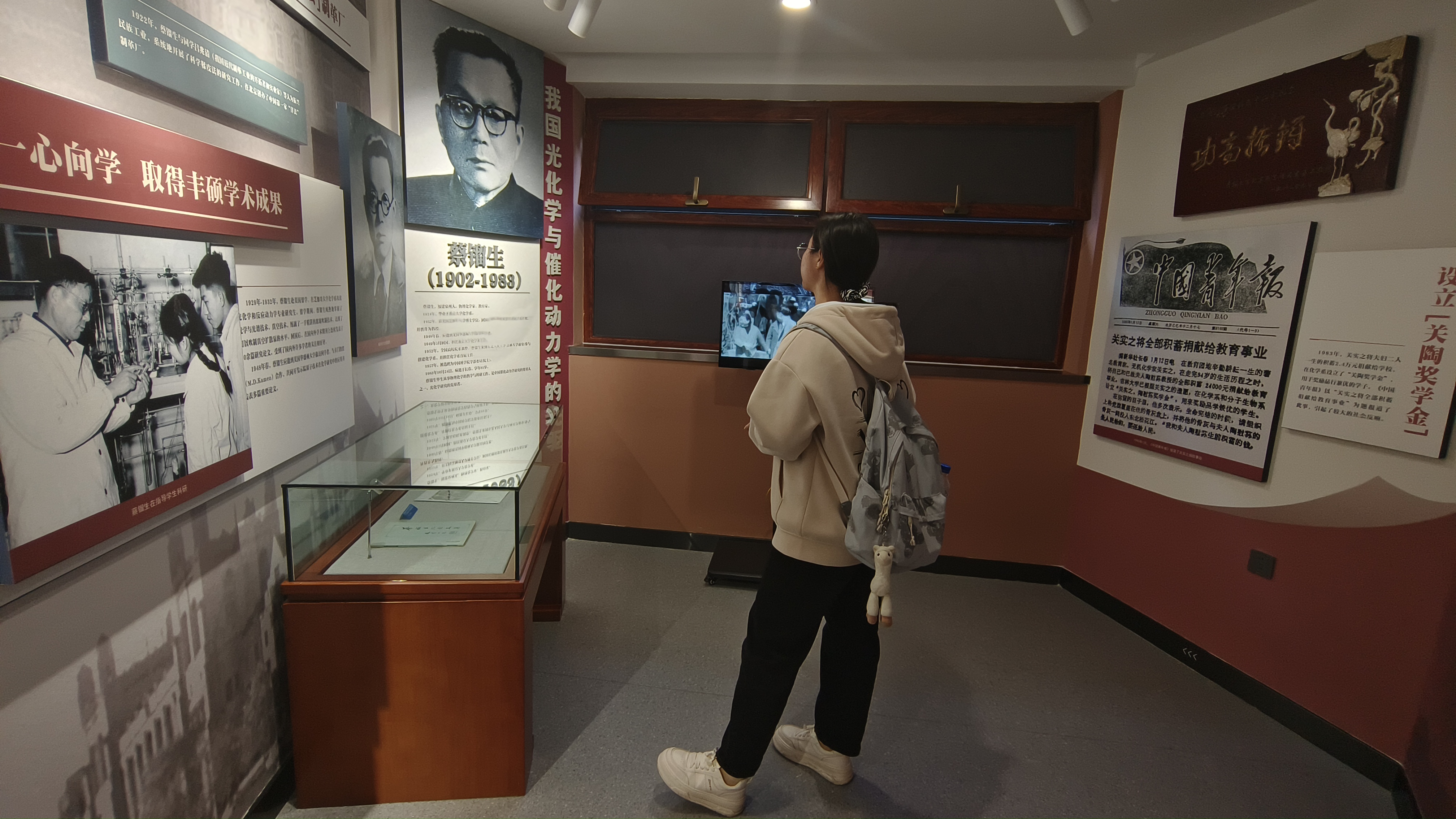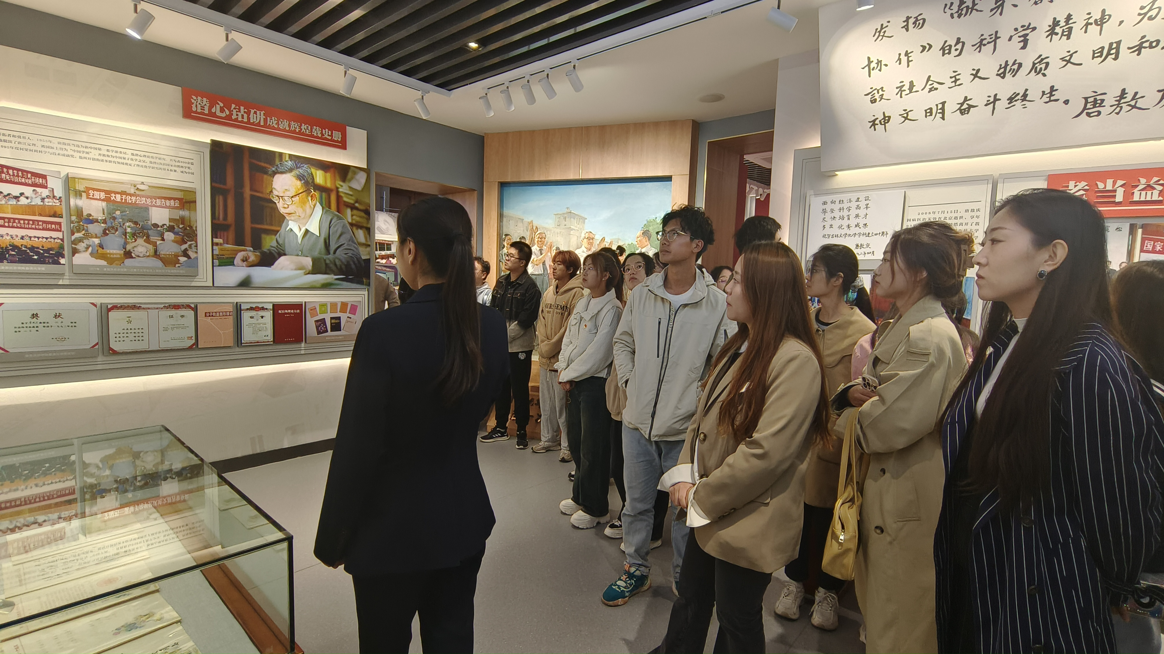随后,学生们又来到“功昭校史”展区,走近“走进书斋是学问家,走出书斋是革命家”的吕振羽,“高瞻远瞩,情系教育”的匡亚明,“科学巨擘、时代典范”的唐敖庆以及徐华清、古大存、贾清汉、殷希彭、喻德渊、刘靖、陆锦、何济林、王恩厚等,倾听12位突出贡献领导人的卓著功勋。一路走来,风雨兼程,奋斗不息,他们带领学校前身东北行政学院一步步发展壮大,为无数桃李提供了学术与人生指导,为党和国家输送了一批批优秀人才。展馆陈列的书籍、旧物,也让学生们对他们为人师表、人格高尚、学术渊博、赤心报国的精神有了更深刻的领悟。