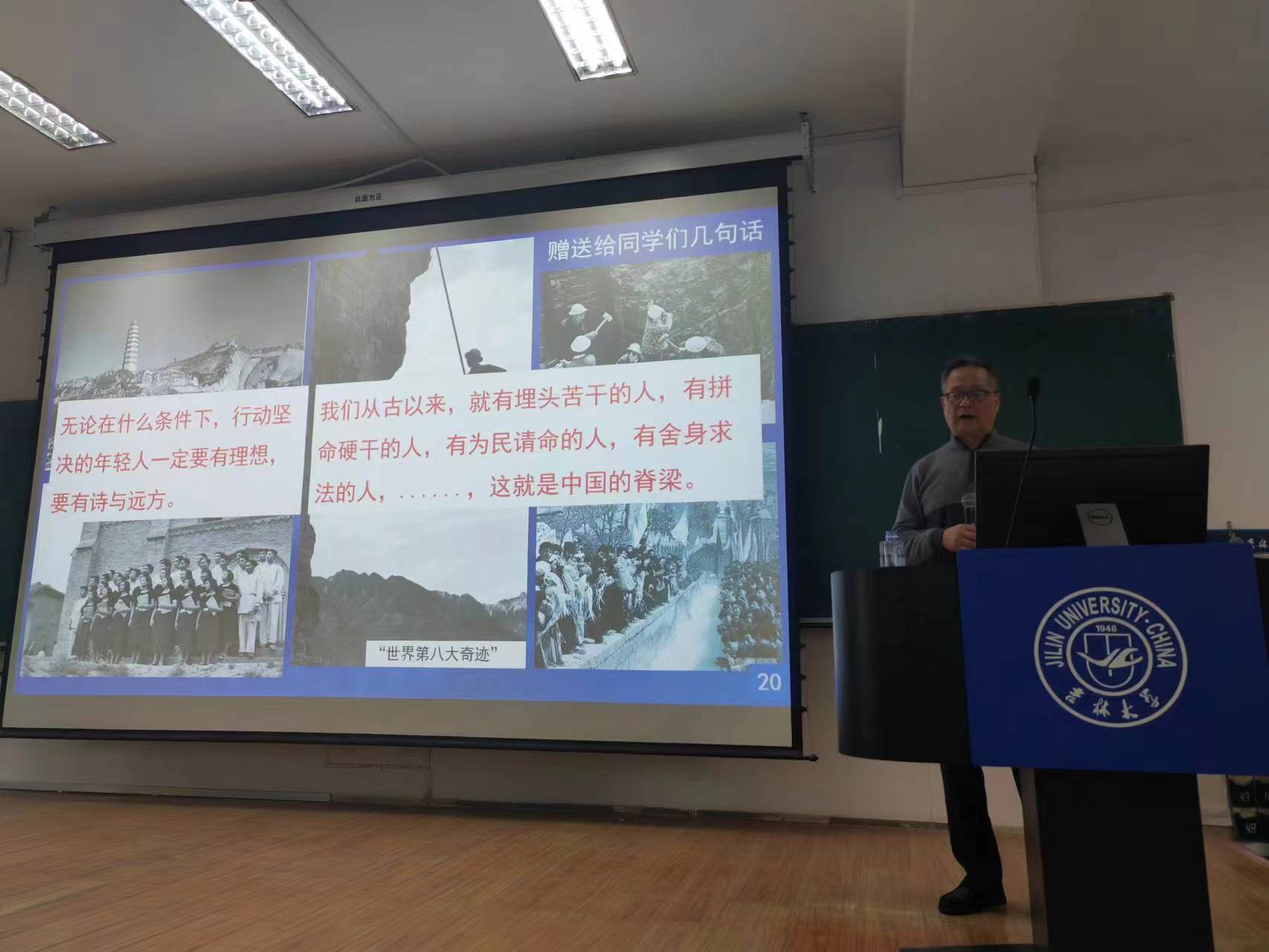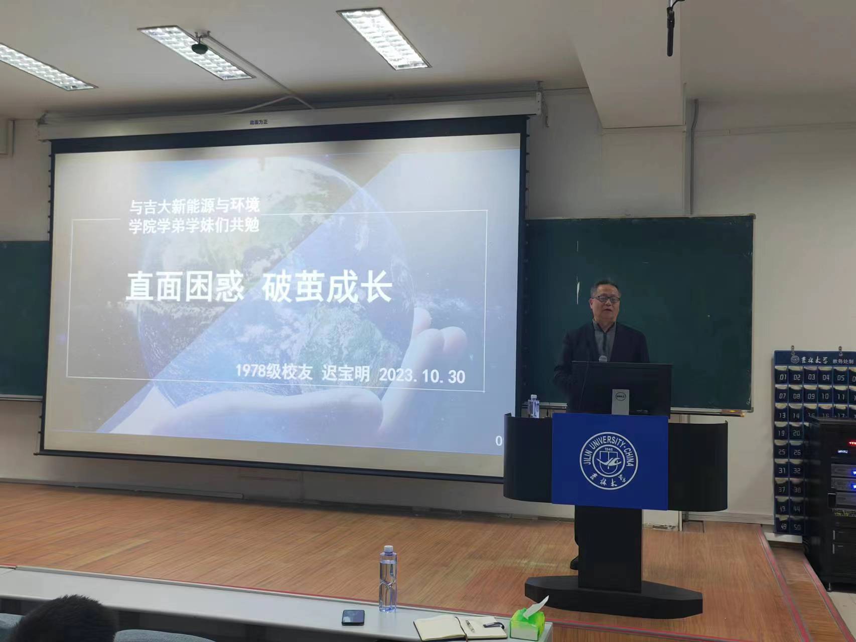 迟宝明教授向同学们介绍了黄大年老师的光辉事迹,并引用自己和身边同学的切身实例,鼓励同学们:凡是优秀的年轻人,如果想有造就,就必须有大胸怀,大境界,大抱负。珍惜人生意义,提倡奋斗精神。