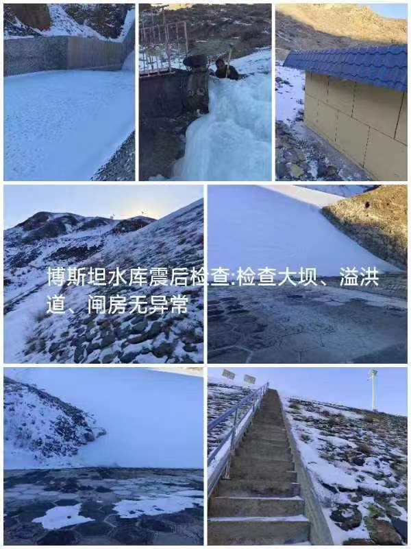 在后续的工作中,我随木垒县博斯坦水库工作人员来到了博斯坦乡进行水库震后检查,包括检查大坝、溢洪道、闸房。随车行驶60公里后,我们来到了距县城最远的水库--博斯坦水库,到最后只剩零星的几间房子,其中一间就是水库管理人员的生活区域,三室两厅写满了他们的坚守。北风呼啸,当只在图片上见过的水利工程赫然出现在眼前,我感受到了深深的震撼,震撼于庞大的工程建筑、震撼于建筑师的智慧、震撼于水利人的坚守。随后专业人员对大坝、溢洪道、闸房都进行了细致的检查,最终检查结果一切良好。由于处于新疆地震带,小地震不断,每次经历地震后,这样细致全面的检查都会开展一次,保障了全县人民的生命财产安全。返回的路上,站长讲起了多年前突发的水灾对他们启发很大,那次事情后,县水利部门深刻反思,采取有力措施巩固防洪系统,开始24小时水情监测,向全县人民普及防洪自救知识。通过了解当年更多的细节,我更加理解了水利人身上的使命和担当。