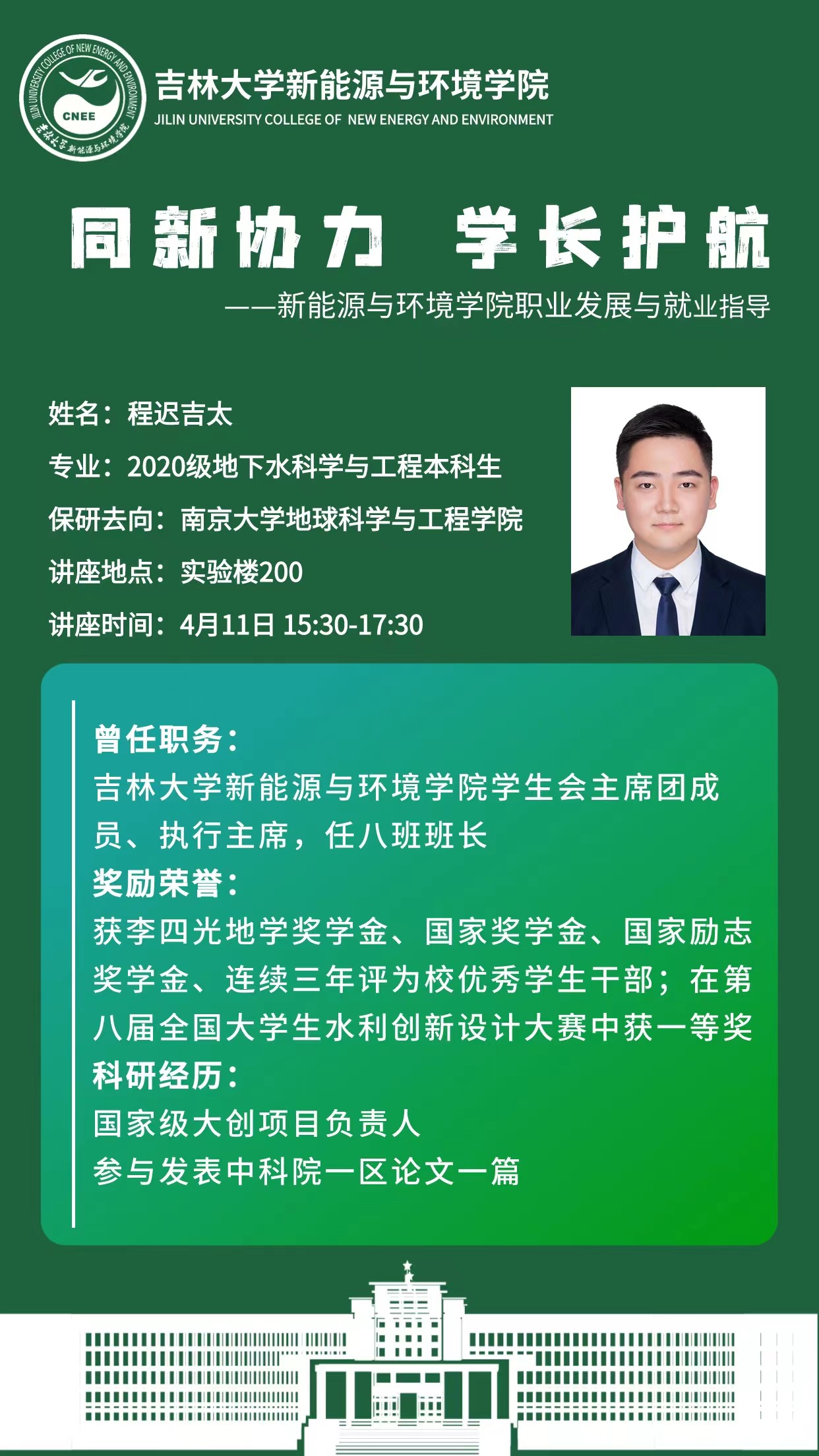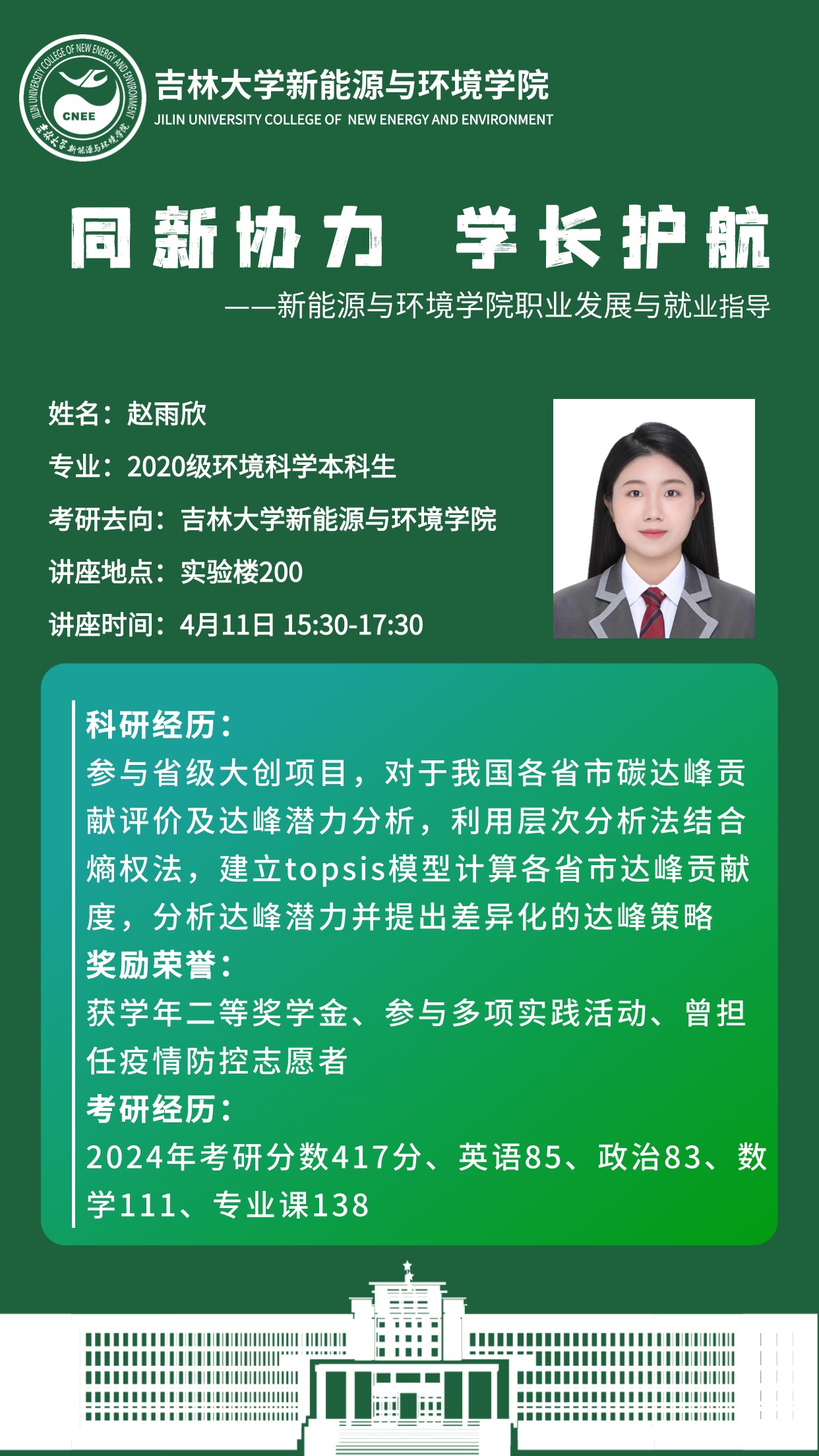 本次活动主讲人为四名2024年优秀应届毕业生。水文与水资源工作专业韩采奕同学在2024年黑龙江省定向选调考试中笔试、面试均列第一,成功上岸黑龙江省大庆市水务局;地下水科学与工程专业程迟吉太,于2023年成功推免至南京大学地球科学与工程学院;环境科学专业赵雨欣2024考研分数417分,为巨乳自拍