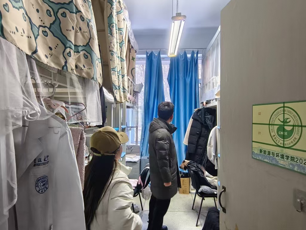 12月6日,2024级新生辅导员助理姜兆轩进入南苑一公寓寝室,检查寝室卫生和同学们的在校情况,并提醒同学们已经进入期末月,要尽早开始复习。