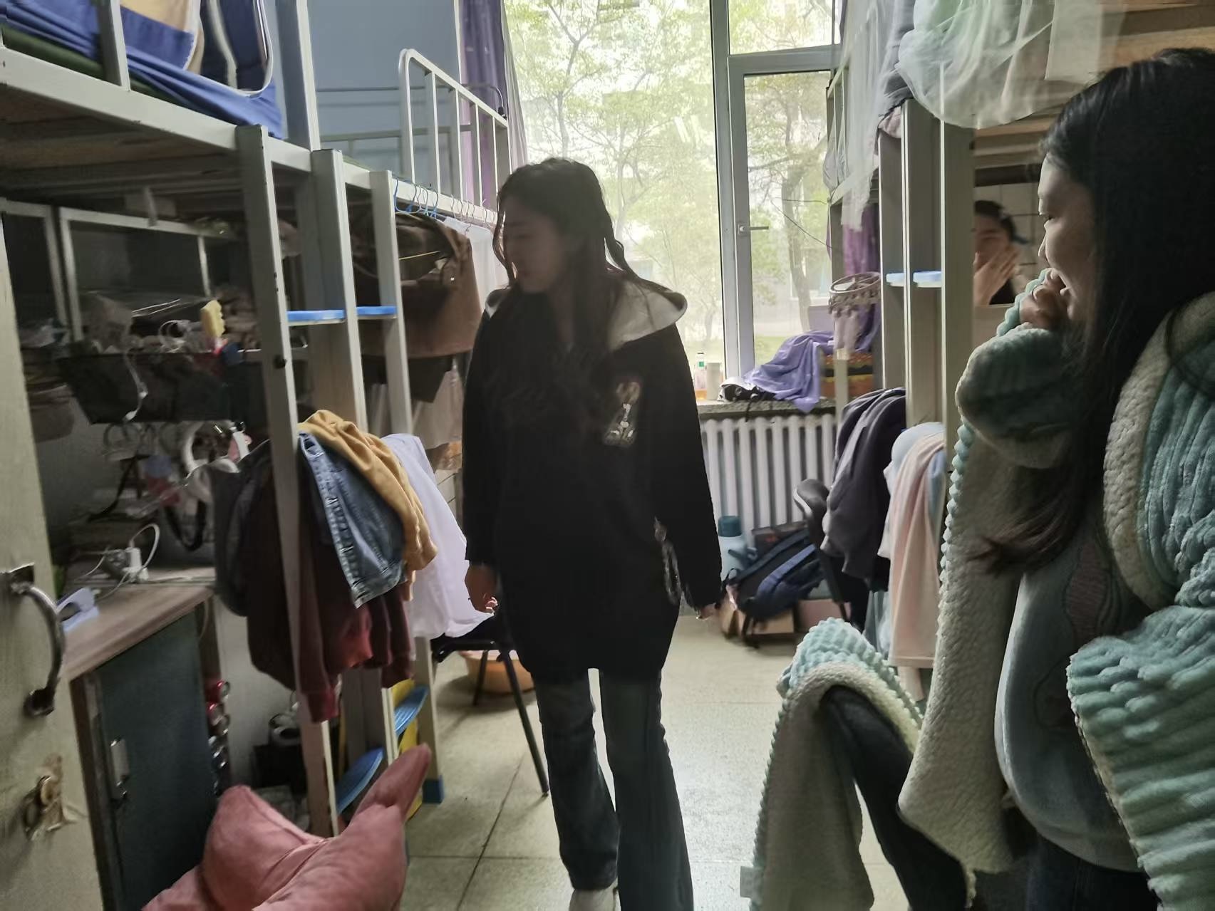 5月11日,2023级辅导员姜岳彤老师进入南苑一公寓学生寝室,检查宿舍卫生及违章电器情况,并提醒学生定期开窗通风,营造良好寝室环境。