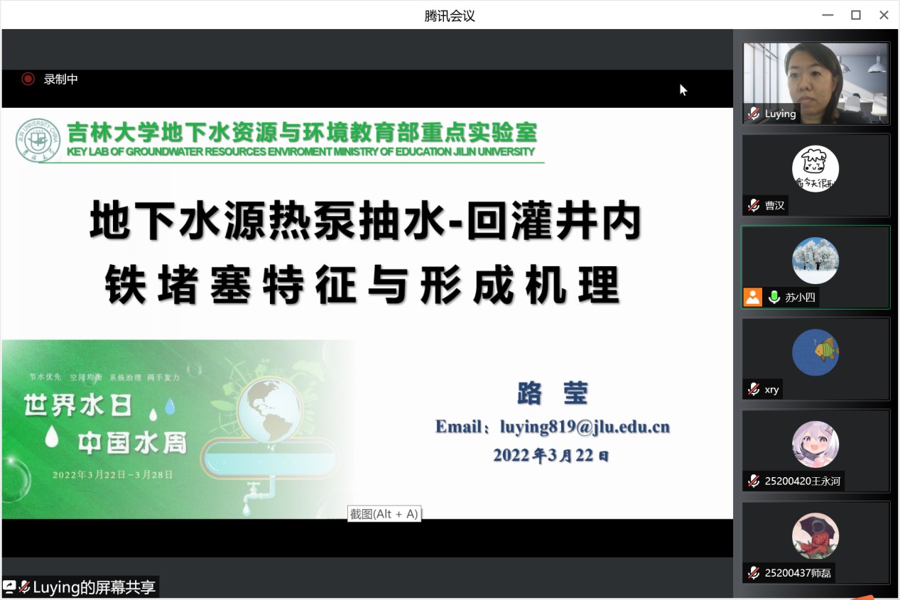院长许天福教授简要回顾了世界水日的由来和主旨,重点介绍了2022年世界水日和中国水周的活动主题。其后,王福刚教授、冯右骖副教授、吕航副教授、吕颖副教授、张晓影副教授、王宇博士和路莹副教授等7位中重点实验室青年骨干教师围绕寒旱区地下水资源形成与评价、包气带水分运动与污染质迁移转化、花岗岩裂隙中核素迁移、城市海绵城市雨洪过程和流域非点源污染过程模拟、地下水人工补给等主题汇报了各自近年来取得的最新进展,与参会师生进行了积极互动和深入交流。最后,苏小四教授对本次学术交流活动进行了总结。