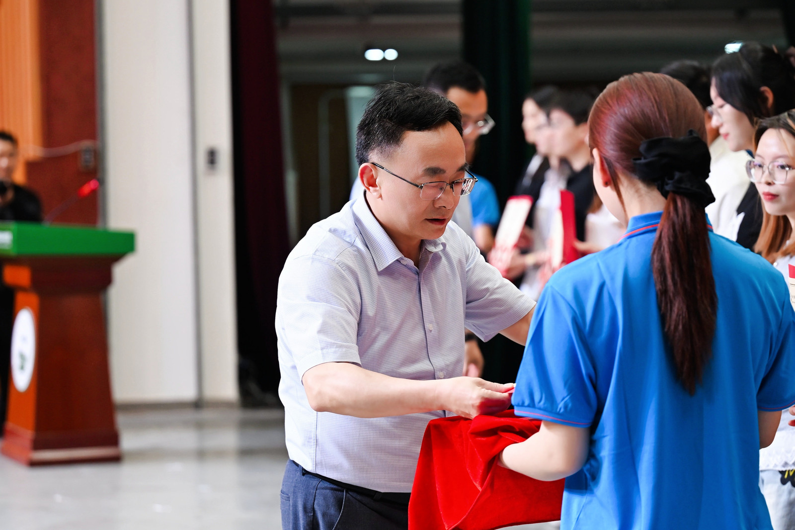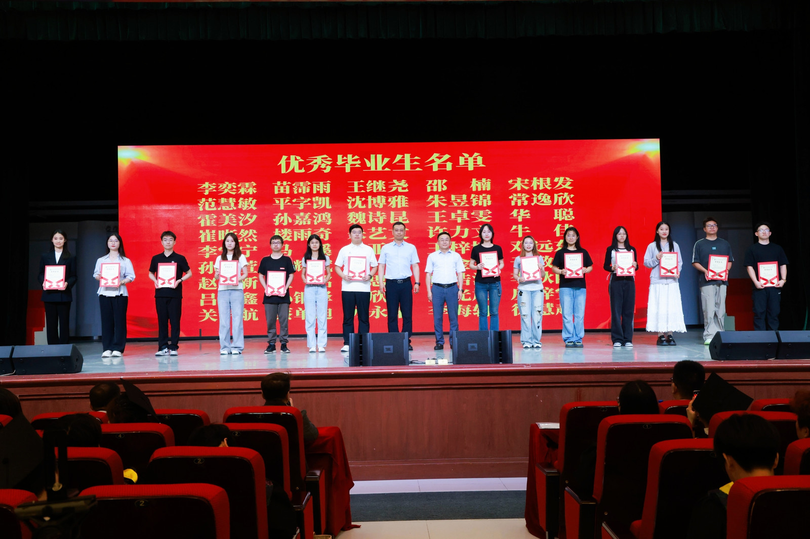 典礼在庄严的国歌声中拉开序幕。副院长张文静宣读《关于表彰巨乳自拍 2025届优秀毕业生的决定》,院长董双石、党委书记汪祥松为45名优秀毕业生代表颁奖。