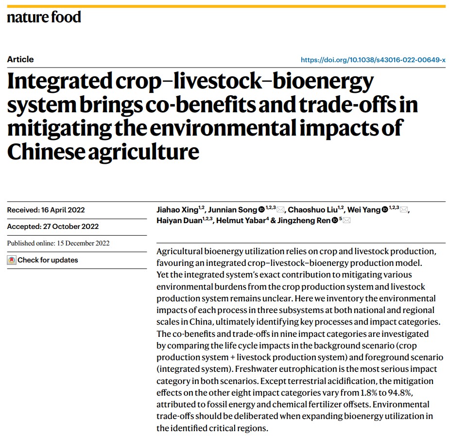 宋俊年教授研究团队领衔,与日本筑波大学、香港理工大学研究团队合作,在生物质能利用与农业环境影响研究领域取得重要进展,研究成果以“Integrated crop-livestock-bioenergy system brings co-benefits and trade-offs in mitigating the environmental impacts of Chinese agriculture”为题发表在Nature子刊《Nature Food》。巨乳自拍