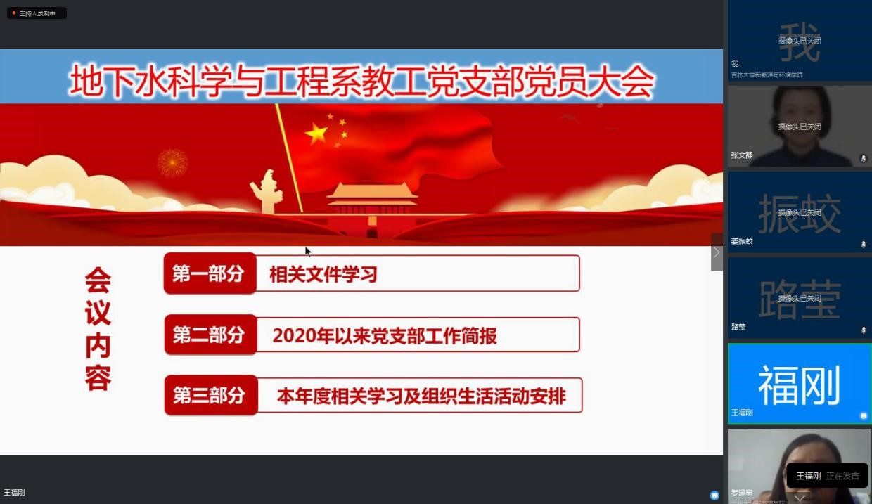 在疫情期间的各项工作任务,地下水科学与工程系教工党支部于2020年4月29 日召开了支部全体党员大会,会议采用在线视频会议形式进行。会议包括三方面内容:分别是政治理论学习、本支部2020年度以来特别是疫情期间的的阶段性工作情况汇报、以及2020年度支部工作安排。
