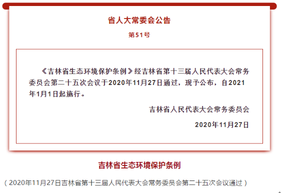 11月27日,《吉林省生态环境保护条例》经吉林省第十三届人民代表大会常务委员会第二十五次会议通过,将于2021年1月1日起施行。