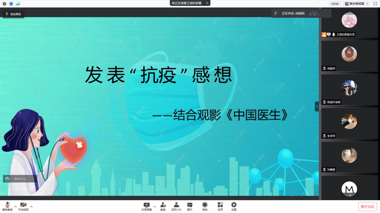 会上,王莹向大家介绍了本次会议的内容以及形式,并嘱咐大家在疫情期间,要注意卫生,戴好口罩,时刻不要掉以轻心。之后,各位党员结合观影《中国医生》,发表了自己的抗疫感想,对于此次疫情,大家都感悟颇深,作为一名党员,在这段特殊时期,大家都能去主动帮助身边有困难的同学。同时,大家也表达了在封闭期间,能按时吃上饭,保证日常的生活,离不开每一位老师和工作人员的默默付出,作为学生,我们更应该遵守纪律,齐心协力,共抗疫情。同时,大家在封闭的日子里也没有荒废时间,每天都过得很充实。