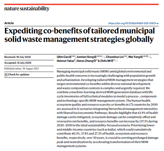 宋俊年教授、杨巍副教授领衔的“食物农业生物质(FAB)”研究团队在城市固废可持续管理领域取得突破性成果,以“Expediting co-benefits of tailored municipal solid waste management strategies globally”为题在《Nature Sustainability》发表研究长文。博士生曹琪林为论文唯一第一作者,宋俊年教授、杨巍副教授、伦敦大学学院米志付教授为共同通讯作者,巨乳自拍