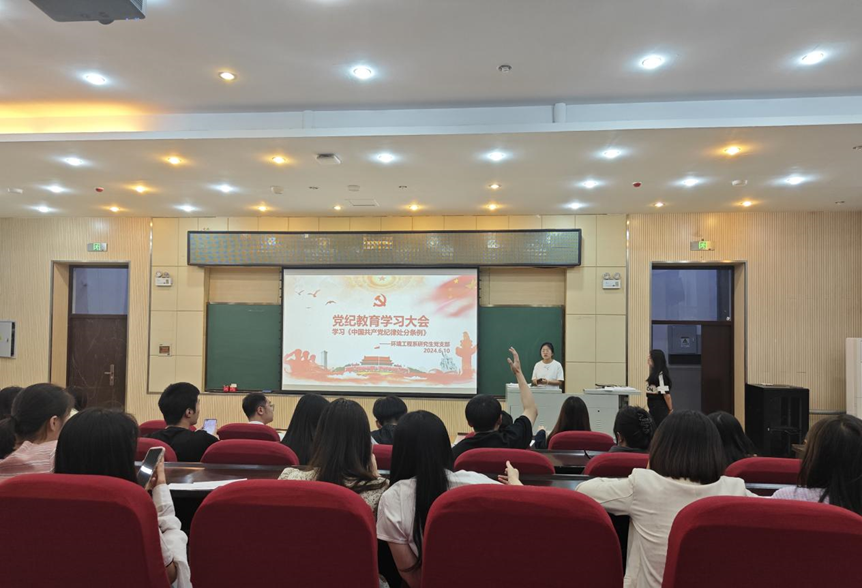 环境科学系研究生第二党支部书记刘昊源带领党员集中学习新修订的《中国共产党纪律处分条例》背景与修订概况、特点、要点内容。通过此次学习,支部党员体会到新时代的学生党员应当在思想上画出红线,筑牢底线,坚决遵守党的规章纪律,用实际行动践行初心使命,让党纪学习教育内化于心,外化于行。